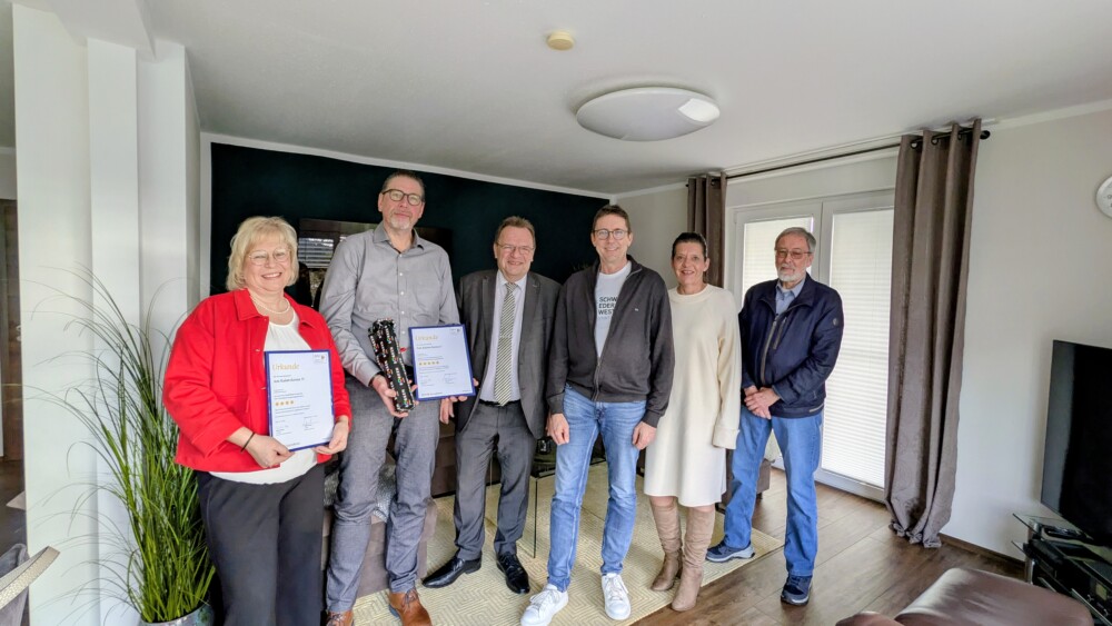 Brigitta und Thomas Scheideler, Gastgeber der Ferienwohnungen am Kaiserkreuz, Landrat Winfried Becker, Bürgermeister Marcèl Pritsch, Tatjana Grau-Becker, Fachbereichsleiterin der Wirtschaftsförderung des Schwalm-Eder-Kreises und Dieter Trinks, DTV-Prüfer. Foto: N.N. | Stadt Borken (Hessen)