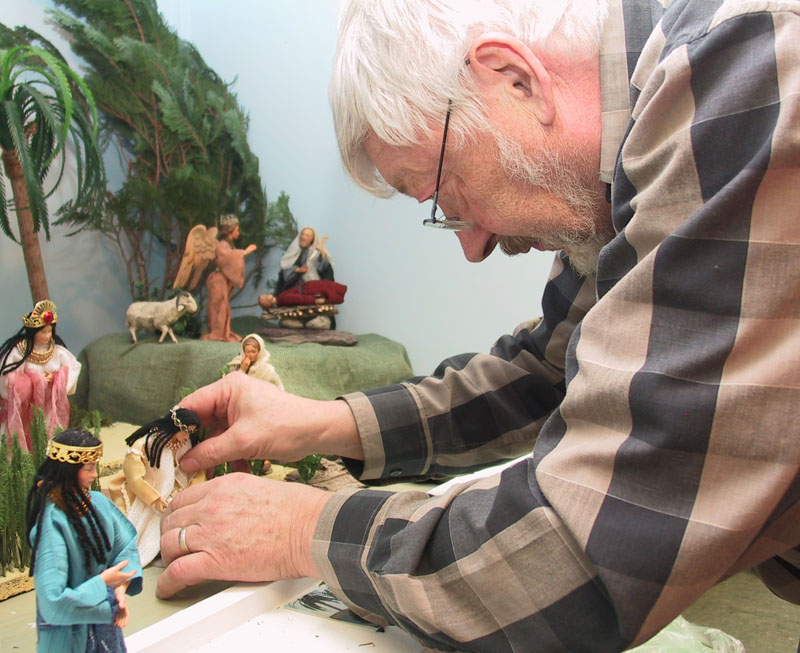 Bild 1: Volle Konzentration: Alle Figuren haben einen festen Platz. Krippenbauer Peter Reus ordnet die Szenen an.