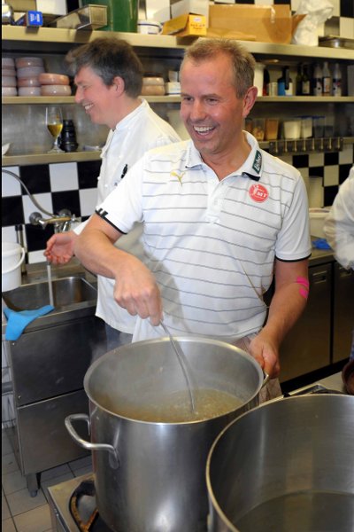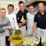 Und dann ging es für Mario Kelentric und Kollegen auch gleich zur Sache: Kartoffeln schälen, Salat waschen, Wachteln zerlegen, Lammfleisch würzen, die Masse für die Creme Brûlée vorbereiten, so lauteten die wichtigsten Tätigkeiten für die 12 “Küchenjungen auf Zeit”. Kräftig unterstützt wurden sie dabei von Trainer Ryan Zinglersen, Aufsichtsratschefin Barbara Braun-Lüdicke, Geschäftsführer Claus Schiffner sowie von Rainer Holzhauer selbst. Und der Grischäfer-Gastronom staunte nicht schlecht, als einige der Handballprofis ihre Talente am Herd aufblitzen ließen.