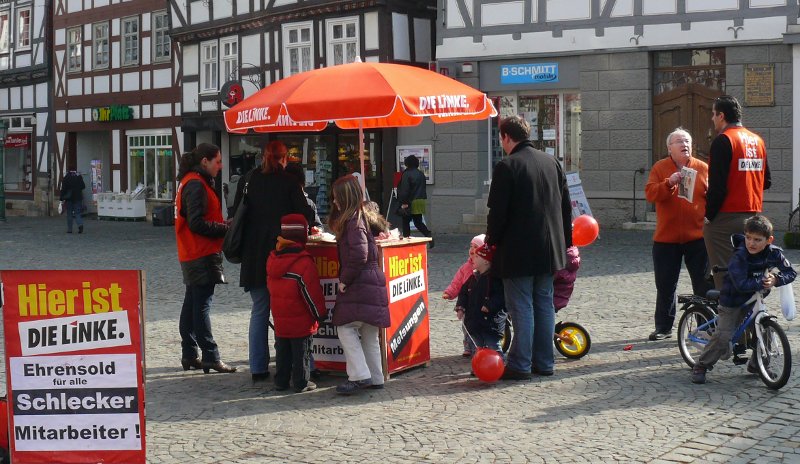 Melsungen. Unter dem Motto „Ehrensold für alle Schlecker-Mitarbeiter“ stand der Infostand der Linken am Samstag in der Bartenwetzerstadt. Viele Menschen seien stehengeblieben und hätten mit ihnen diskutiert, erklären die Linken. Die Passanten hätten sich empört gezeigt über die „Raffgier der Unternehmer, Politiker und Banken, während gleichzeitig die Schlecker Mitarbeiter in die Arbeitslosigkeit geschickt werden“. „Die Ankündigung des Insolvenzverwalters von Schlecker, 16.500 von 30.000 Mitarbeiter zu entlassen, ist ungeheuerlich. Die Mitarbeiter haben für die Familie Schlecker eines der größten Vermögen in Deutschland erarbeitet. Sie jetzt mit einem Fußtritt auf die Straße zu befördern, ist kaltschnäuzig und brutal“, erklärt Jochen Böhme-Gingold, Kreisvorsitzender der Linken.