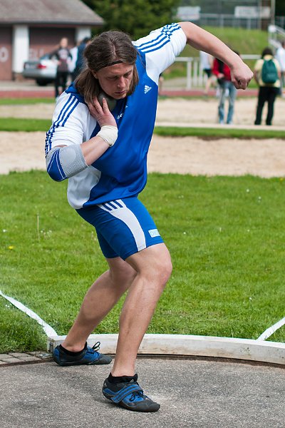 Nach der verletzungsbedingten Absage von Titelverteidiger Tobias Hepperle (VfB Stuttgart), der im Vorjahr mit einer Leistung von 18,00 Meter gewonnen hatte, kam es bei den Männern zum erwarteten Duell der beiden Sindelfinger Artur Hoppe und Tobias Dahm. Bereits beim Einstoßen ließen die beiden DLV-Asse die Kugel mehrfach an die 19 Meter-Marke fliegen. Tobias Dahm verbesserte sich im dritten Durchgang auf 18,51 Meter, aber Artur Hoppe steigerte sich im fünften Versuch auf 18,58 Meter. Hoppe war der eigentliche Favorit, denn der 23-Jährige hatte bei den deutschen Hallenmeisterschaften im Februar als Dritter die Kugel auf 19,64 Meter gewuchtet. Seit Wochen bereitet er sich intensiv für die Ausscheidungswettkämpfe zur Teilnahme an den Olympischen Spielen in London vor. Auch der 2,03-Meter-Riese Tobias Dahm möchte bei diesen Wettkämpfen eine gute Rolle spielen. Im letzten Durchgang kam er, technisch noch stark verbesserungsfähig, auf 18,50 Meter und untermauerte seine gute Form mit fünf gültigen Stößen über die 18m-Marke. Den dritten Platz belegte der Paderborner Johann Gerok mit 16,61 Meter und erzielte damit die gleiche Weite, die er einen Tag vorher bei den deutschen Hochschulmeisterschaften in Kassel als Vizemeister belegt hatte.