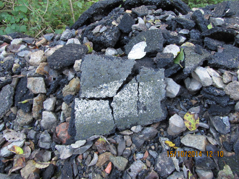 Im Rahmen einer Begehung des Gebietes wurden bislang insgesamt sieben Ablagerungsstellen festgestellt. Es handelt sich offensichtlich um den Abbruch einer Asphaltdecke. Neben Asphaltplatten, die bis zehn Zentimeter stark sind, befinden sich auch Splitt und teilweise Reste von Beton in den Schutthaufen. Auf einigen Asphaltstücken sind weiße Markierungen, ähnlich Fahrbahnmarkierungen zu erkennen.