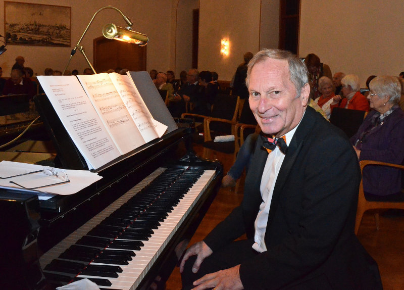 Passend zu den Textpassagen spielte Dr. Ulrich Skubella am Flügel Musik von Ludwig van Beethoven, einem Geistesverwandten Knigges. In der Mehrzahl waren es Stücke, die Beethoven „Bagatellen“ genannt hat. Damit meint der Komponist kurze Einfälle, die immer sehr originelle Geistesblitze und technisch durchaus keine Bagatellen in unserem heutigen Verständnis des Wortes sind. Besonders gut gelang dem Pianisten die Bagatelle As-Dur, op. 33, Nr.7, einem sehr schnellen Stück („presto“) mit einem harmlos wirkenden Motiv, das in immer schnelleren Bewegungen immer mehr Fahrt aufnimmt und mit grandios hämmernden Akkorden in beiden Händen im fortissimo endet.