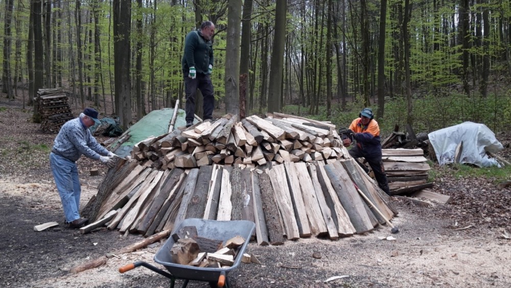 Jesberg. Am Sonntag den 14. Mai 2017 findet nach einer einjährigen Pause wieder das traditionelle Köhlerfest in Jesberg statt. Die Vorbereitungen dafür sind in vollem Gange. Neben den Aufräumarbeiten schneiden, spalten und stapeln die Mitglieder des Köhlervereins jede Menge Holz. Dies ist auch notwendig, um den großen Erdmeiler zu bauen, dessen Bau derzeit im Vordergrund steht. Nach den vielen Schichten aus Holz bekommt der Erdmeiler noch eine Decke aus Heu. Abschließend wird er mit Erde abgedeckt (Das Anstecken des Erdmeilers erfolgt auf dem Köhlerfest).
