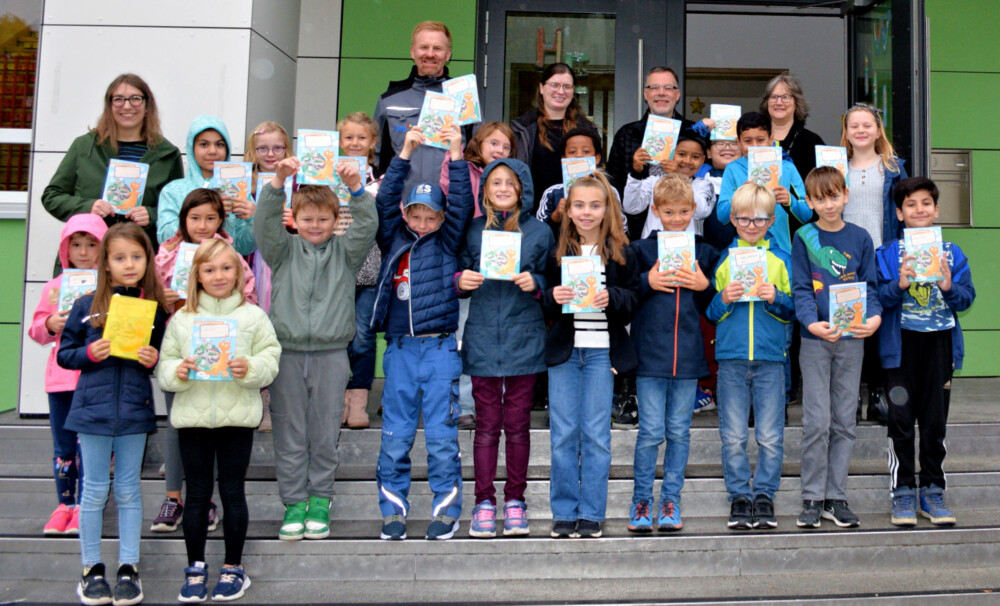 Die städtische Klimaschutzmanagerin Helene Peters stellte das neue Hausaufgabenheft am Donnerstag, 12. Oktober 2023 zusammen mit den Gestaltern des Heftes, Kerstin und Johannes Kramarek, dem Geschäftsführer der kbg Schwalm-Eder, Stefan Fennel (als Sponsor), in der Klasse 2c der Grundschule am Stellberg vor. Dort haben die Schüler aller Klassen und auch die Klasse 2c mit ihrer Lehrerin Lea-Marie Töpfer das Hausaufgabenheft zu Beginn des Schuljahres erhalten. Neben der Stellbergschule wurde das Hausaufgabenheft auch den Schulklassen der THS, der Osterbachschule, der Matthias Claudius Schule und der Elsa Brandström Schule das Hausaufgabenheft zur Verfügung gestellt.