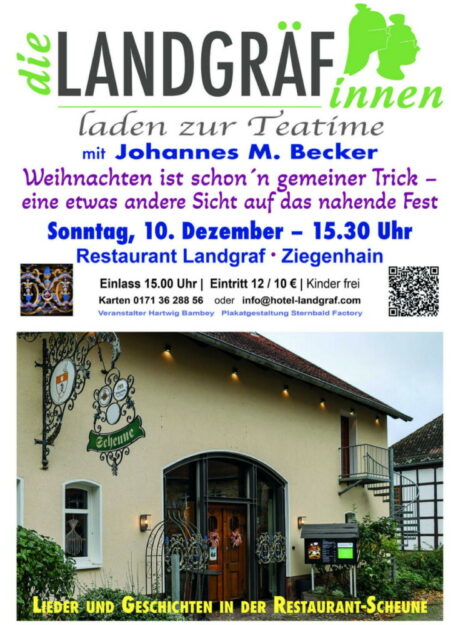 Ziegenhain. Für Sonntagnachmittag, 10. Dezember, laden die »Landgräfinnen« nach Ziegenhain ein. Angekündigt wird eine adventliche Teatime ab 15.30 Uhr mit Kaminatmosphäre im Scheunen-Restaurant. Eine Woche vor dem Schwälmer Weihnachtsmarkt präsentiert Johannes M. Becker sein Programm »Weihnachten ist schon’n gemeiner Trick – eine etwas andere Sicht auf das nahende Fest«.