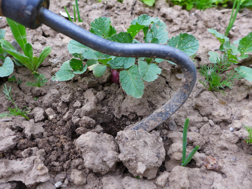 Eine andere Möglichkeit, die Wasserverdunstung des Bodens zu reduzieren, ist die wiederkehrende oberflächige, schonende Bodenbearbeitung mittels Sauzahn, Hacke, Rosengabel, Gartenkralle o. ä. Dadurch werden die Bodenkapillare gekappt, wodurch sich die Verdunstung von im Boden gespeichertem Wasser reduziert. Gleichzeitig ist der aufgelockerte Boden auch wieder besser in der Lage, Niederschlagswasser aufzunehmen, welches ansonsten eher abfließen würde.