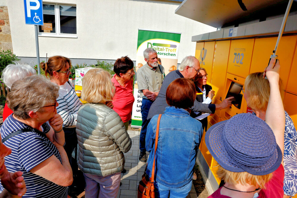 „Mit der Poststation bieten wir eine einfach zu bedienende Lösung für den Versand und Empfang von Briefen und Paketen, die nahezu alles ermöglicht, was in einer Filiale in Auftrag gegeben werden kann“, erklärte Gabriele Schulz, die sich gerne in den Dienst der Sache stellte und den interessierten Bürgern des Digital-Treffs Morschen den Post-Automaten anschaulich erklärte.