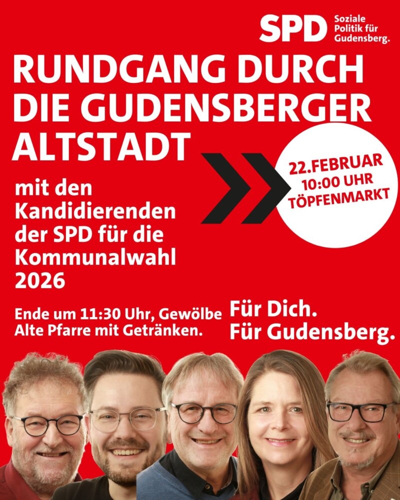 Gudensberg. Zu einem Rundgang durch die Altstadt lädt die SPD Gudensberg am Sonntag, dem 22. Februar 2026 um 10.00 Uhr ein. Start ist am Töpfenmarkt/Untergasse am Brunnen mit den Schweinen. Unterwegs wollen die Sozialdemokraten und ihre Gäste über verschiedene Themen sprechen.