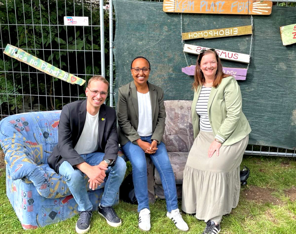 Homberg (Efze). Die Bundestagsabgeordnete Awet Tesfaiesus, der Landtagsabgeordnete Christoph Sippel sowie die Kreisvorsitzende Stefanie Pies von Bündnis 90/Die Grünen besuchten am Freitag das Musikschutzgebiet-Festival in Homberg. Bei ihrem Rundgang über das Festivalgelände informierten sich die Politiker über das ehrenamtliche Engagement der Organisatoren sowie die nachhaltigen Konzepte des Veranstalterteams.