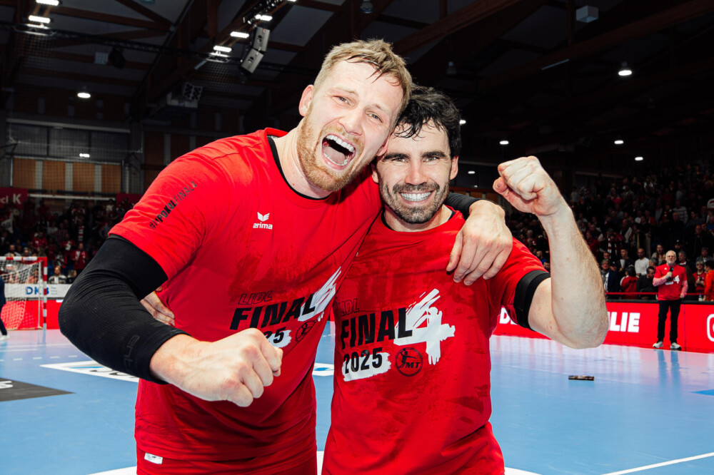 Am Samstag geht es für die MT Melsungen in der Lanxess-Arena um den DHB-Pokal. Die Vorfreude auf Köln ist riesengroß – unter anderem bei Spielmacher Erik Balenciaga, im Bild mit David Mandic nach dem gewonnenen Viertelfinale in Flensburg. Foto: Alibek Käsler