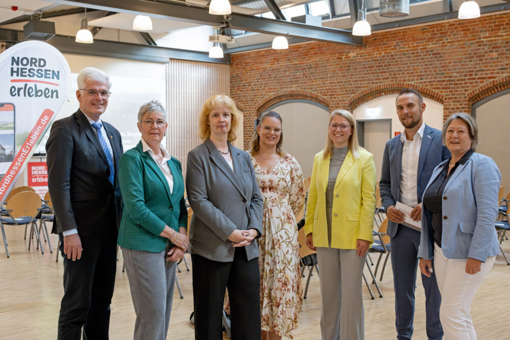 Von links: Landrat Torsten Warnecke (Hersfeld-Rotenburg), Ulrike Hund (Erste Stadträtin Melsungen), Marion Seitz, Tabea Schneider (beide Projektmanagement Regionalmanagement Nordhessen), Landrätin Nicole Rathgeber (Werra-Meißner-Kreis), Kai Georg Bachmann (Geschäftsführer Regionalmanagement Nordhessen) und Angela Eisenblätter (Clusterleitung Tourismus Regionalmanagement Nordhessen). Foto: Andreas Berthel