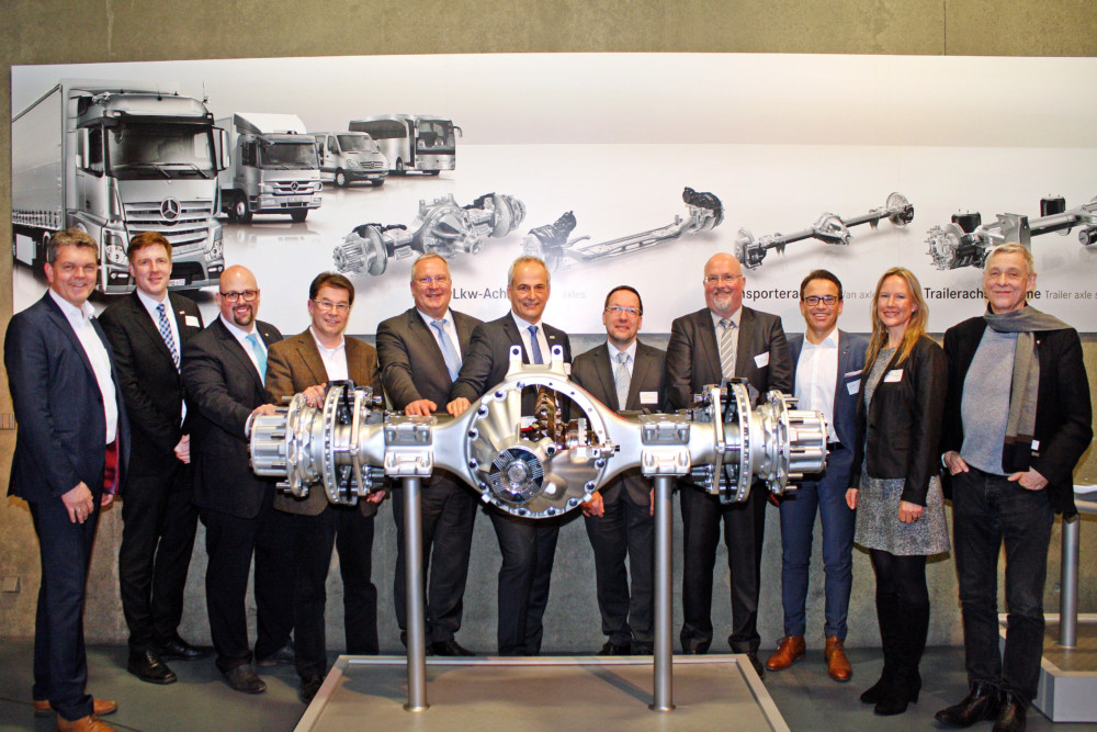 Heiko Hillwig, Leiter Standortkommunikation Volkswagen AG Baunatal, Markus Oeste, Stellv. Leitung Mobilität Regionalmanagement Nordhessen GmbH, Marco Gajewski, Leiter Fertigungssteuerung, Anlaufmanagement & Logistik Outbound Daimler AG – Mercedes Benz Werk Kassel, Prof. Dr. Carsten Sommer, Fachgebietsleiter, Universität Kassel FG Verkehrsplanung und –systeme, Stefan Meister Vorstandsvorsitzender, Meister AG, Jörg Paul, Mitglied der Geschäftsführung, Libri GmbH, Stefan Rückartt, Werksleiter Bombardier Transportation GmbH Kassel, Steffen Riepe, Plant Manager, Dr.-Ing. Ulrich Esterer GmbH & Co. Fahrzeugaufbauten und Anlagen KG, Carsten Rahier, Geschäftsführender Gesellschafter, sera Unternehmensgruppe, Dr. Astrid Szogs, Leitung Mobilität, Regionalmanagement Nordhessen GmbH und Prof. Dr. Helmut Holzapfel (v.l.). Foto: nh